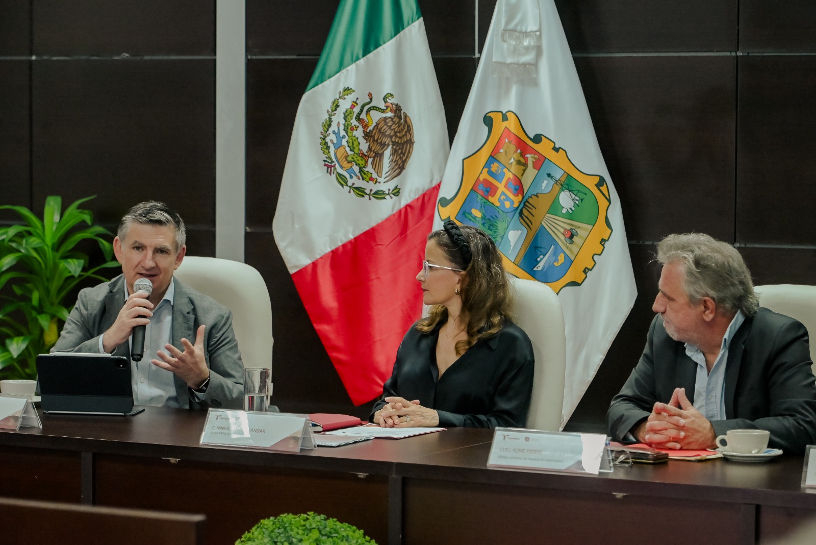 La delegación de directivos de empresas francesas en México fue encabezada por Guillaume Pierre, cónsul general de Francia en Monterrey; David Ribot, vicepresidente de la Cámara de Comercio e Industria Franco Mexicana, y Claire Barnoiun, directora de la Cámara de Comercio e Industria Franco Mexicana Capítulo Noreste.