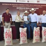 Al acudir en representación del secretario de Desarrollo Rural, Antonio Varela Flores, el subsecretario de Desarrollo Agrícola, Eliseo Camacho encabezó el evento donde entregó 136 bultos de semilla a 76 productores que sembraran una superficie de 271 hectáreas, esto como parte del programa 107 Apoyo al Desarrollo Productivo y Económico Componente I: Apoyos para la Producción Primaria Agrícola.