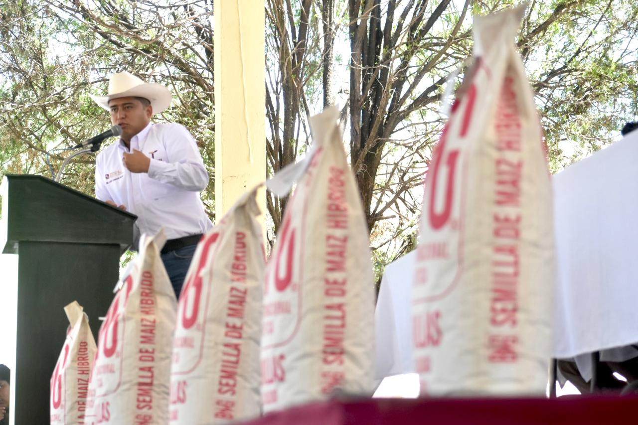 Al acudir en representación del secretario de Desarrollo Rural, Antonio Varela Flores, el subsecretario de Desarrollo Agrícola, Eliseo Camacho encabezó el evento donde entregó 136 bultos de semilla a 76 productores que sembraran una superficie de 271 hectáreas, esto como parte del programa 107 Apoyo al Desarrollo Productivo y Económico Componente I: Apoyos para la Producción Primaria Agrícola.