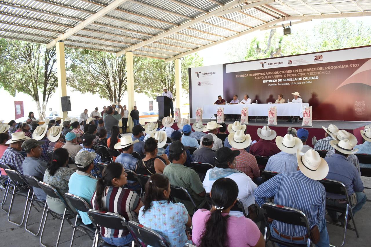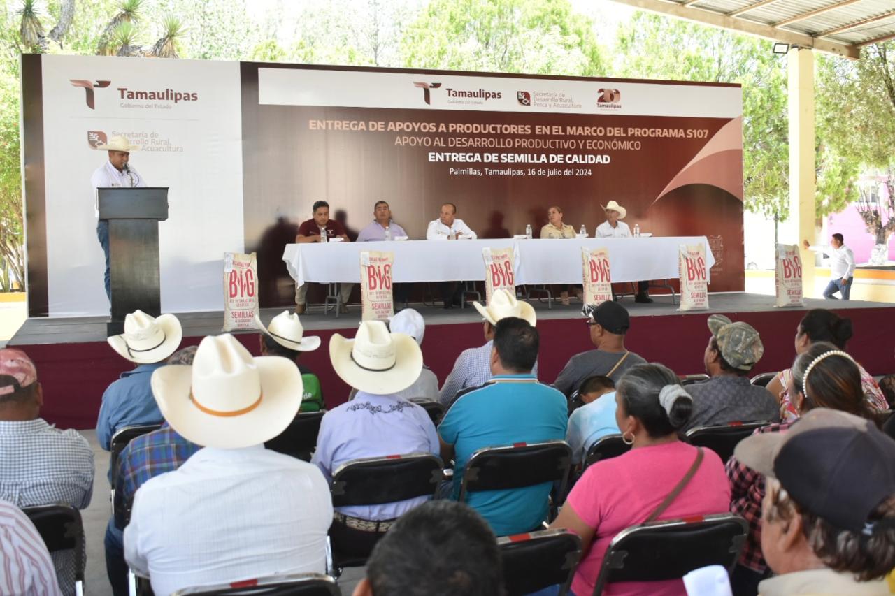 Palmillas, Tamaulipas.- Con la firme intención de continuar apoyando a los productores del estado con programas y recursos que contribuyan al desarrollo sostenible del sector agropecuario, el Gobierno del Estado realizó la entrega de 2.72 toneladas de Semilla de Calidad de Maíz a productores rurales del municipio de Palmillas.